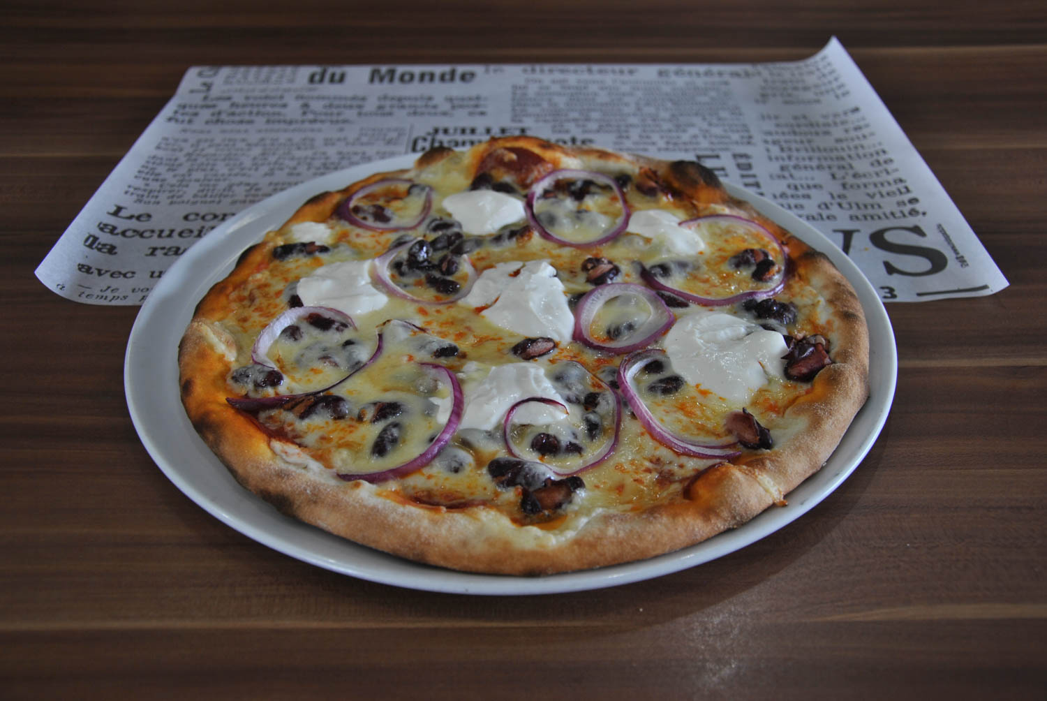 vékony tészta, tejfölös alap, kolbász, bab, hagyma, füstölt sajt, tejföl a tetején